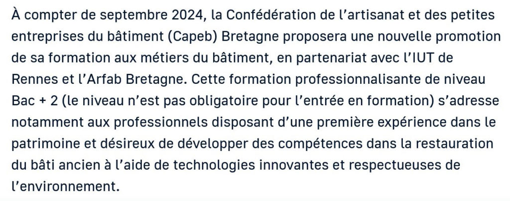 “À compter de septembre 2024, la Confédération de l’artisanat et des petites entreprises du bâtiment (Capeb) Bretagne proposera une nouvelle promotion de sa formation aux métiers du bâtiment, en partenariat avec l’IUT de Rennes et l’Arfab Bretagne. “