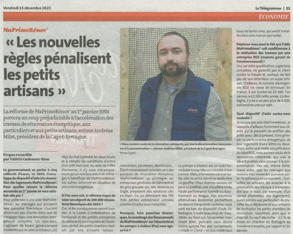 “La réforme de MaPrimeRénov’ au 1er janvier 2024 portera un coup préjudiciable à l’accélération des travaux de rénovation énergétique, aux particuliers et aux petits artisans, estime Andréas Milet, président de la Capeb Bretagne.