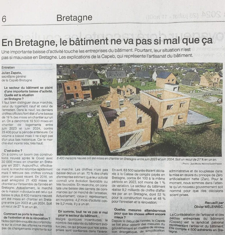 ” Une importante baisse d’activité touche les entreprises du bâtiment. Pourtant, leur situation n’est pas si mauvaise en Bretagne. Les explications de la Capeb, qui représente l’artisanat du bâtiment. “